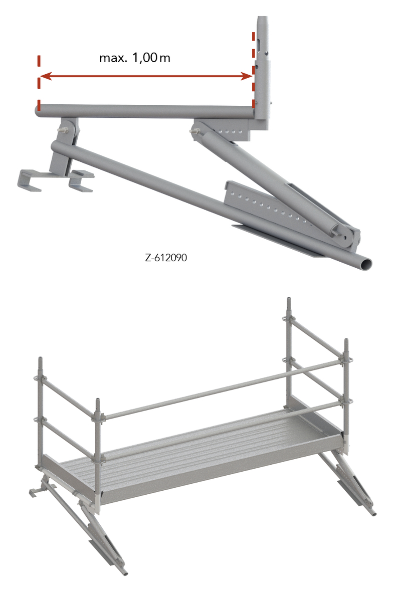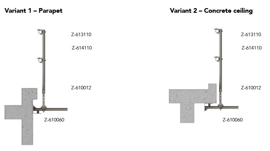 Flat roof guardrail brackets, together with coupled standards brackets, are mounted at a distance of 2 to 3.2 m, depending on the brickwork. Only scaffolding tubes with a diameter of 48.3 mm or aluminium beams may be used as guard rails.