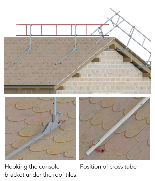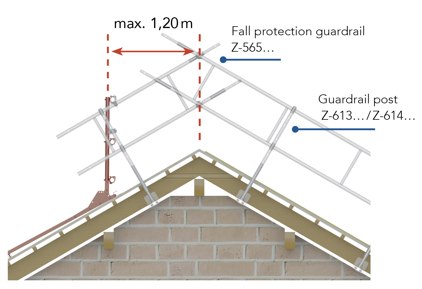 Building on the Tobler rafter clamps, guardrail standards with half-couplings are used to attach the upper and lower scaffolding tubes to the gable guardrail. The guard rail standards are secured in place using pins or screws.